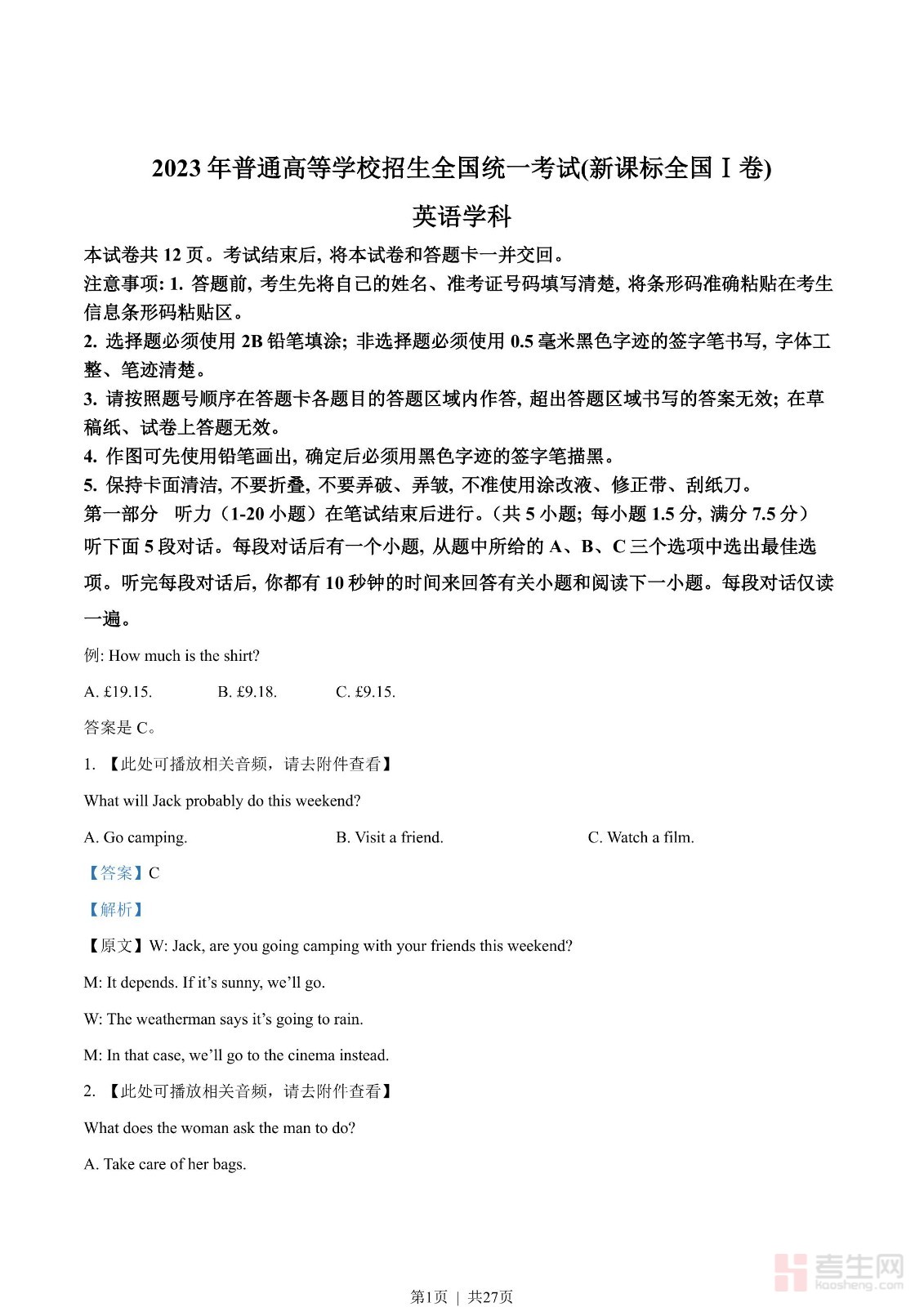2023年高考英语试卷(新课标Ⅰ卷)(解析卷)