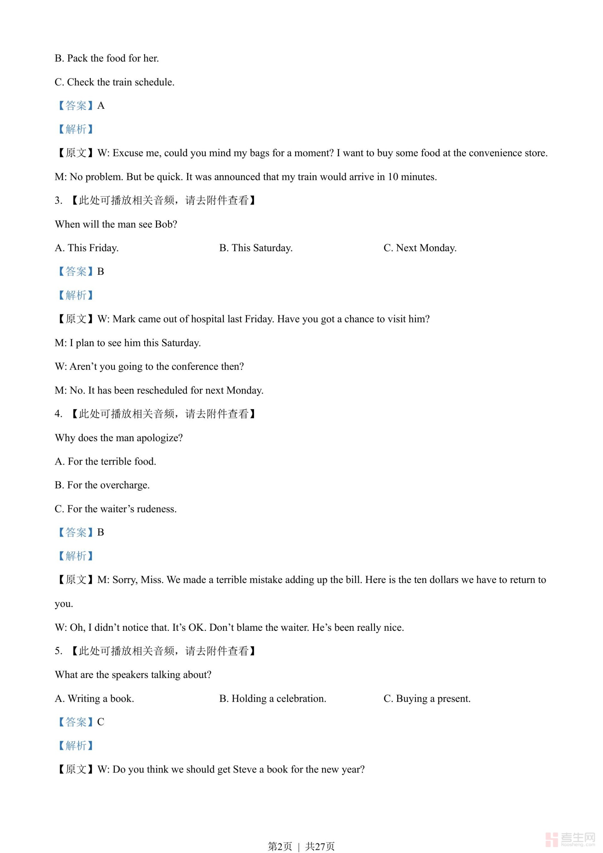 2023年高考英语试卷(上海)(春考)(解析卷)