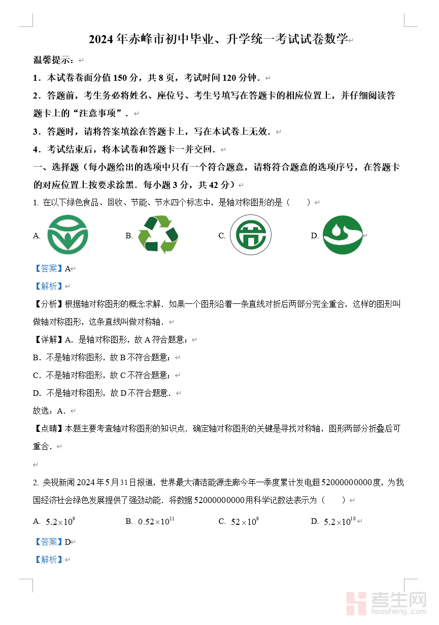 2024年内蒙古自治区赤峰市中考数学试题(解析版)