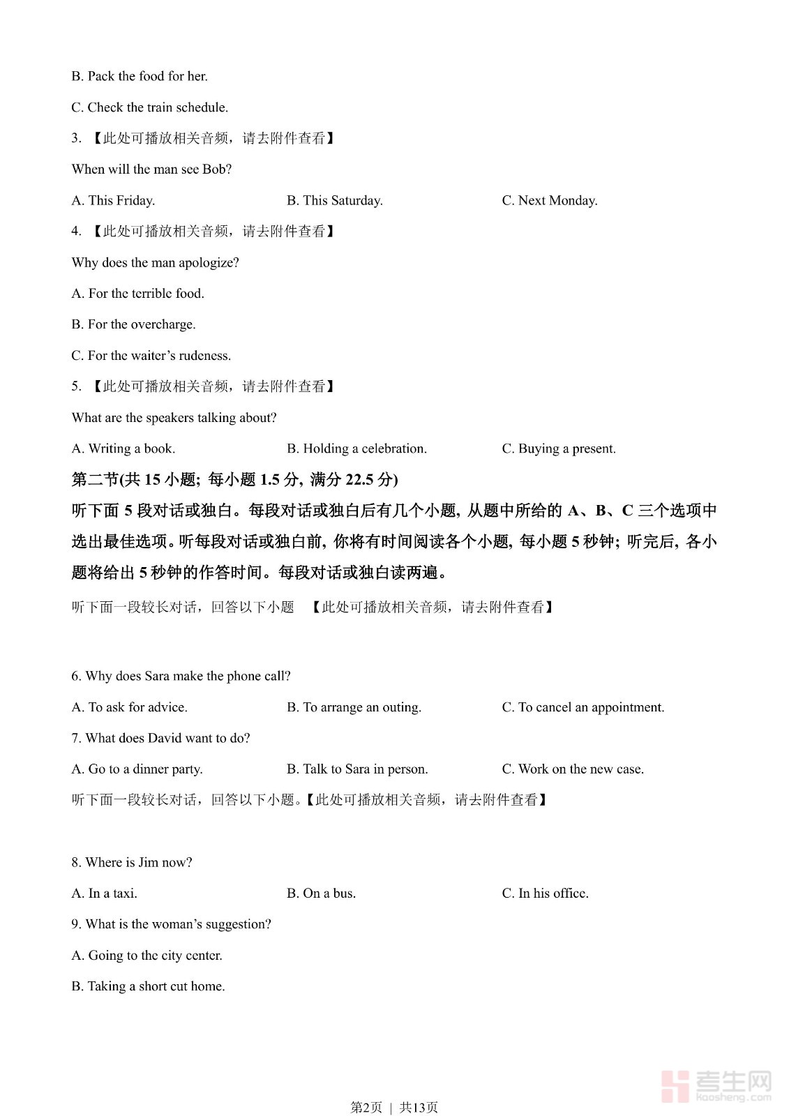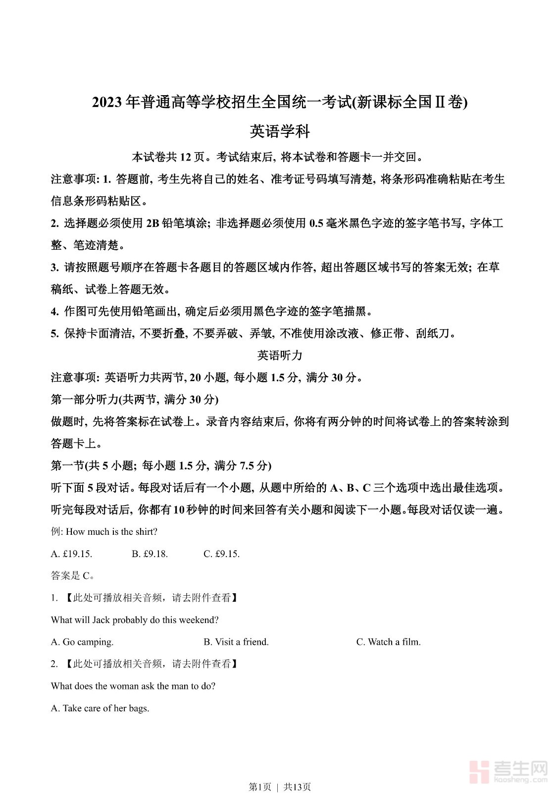 2023年高考英语试卷(新课标Ⅱ卷)(空白卷)含听力音频