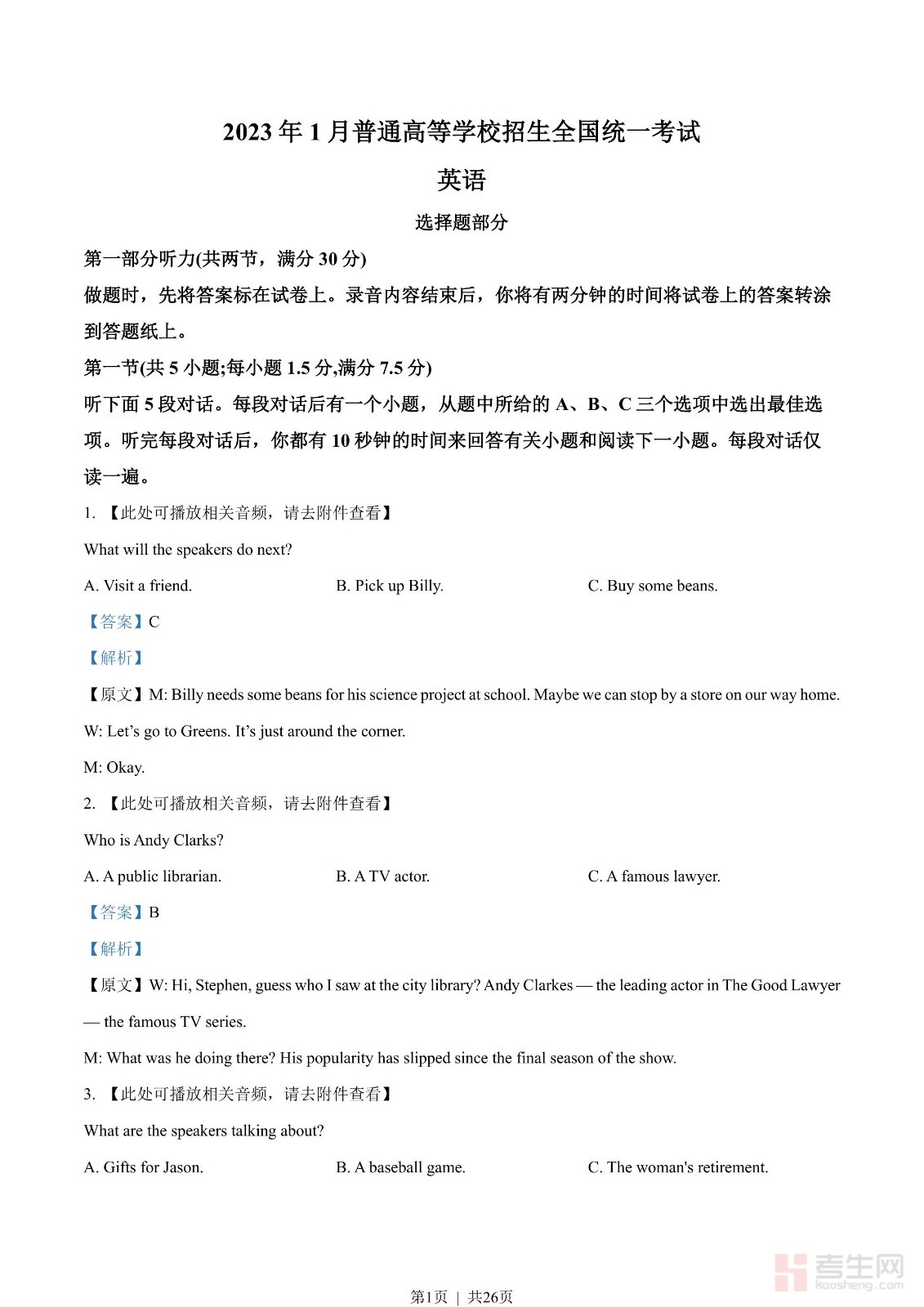 2023年高考英语试卷(浙江)(1月)(空白卷)含听力音频