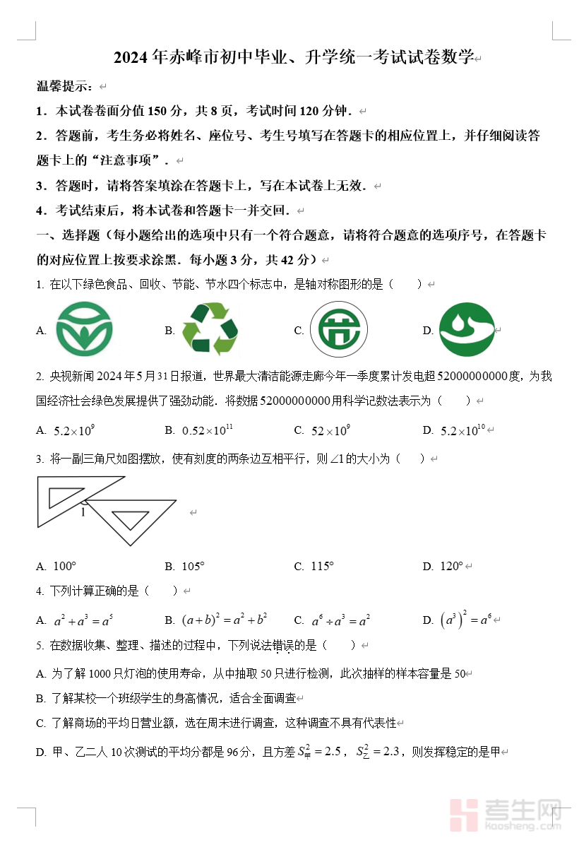 2024年内蒙古自治区赤峰市中考数学试题(原卷版)