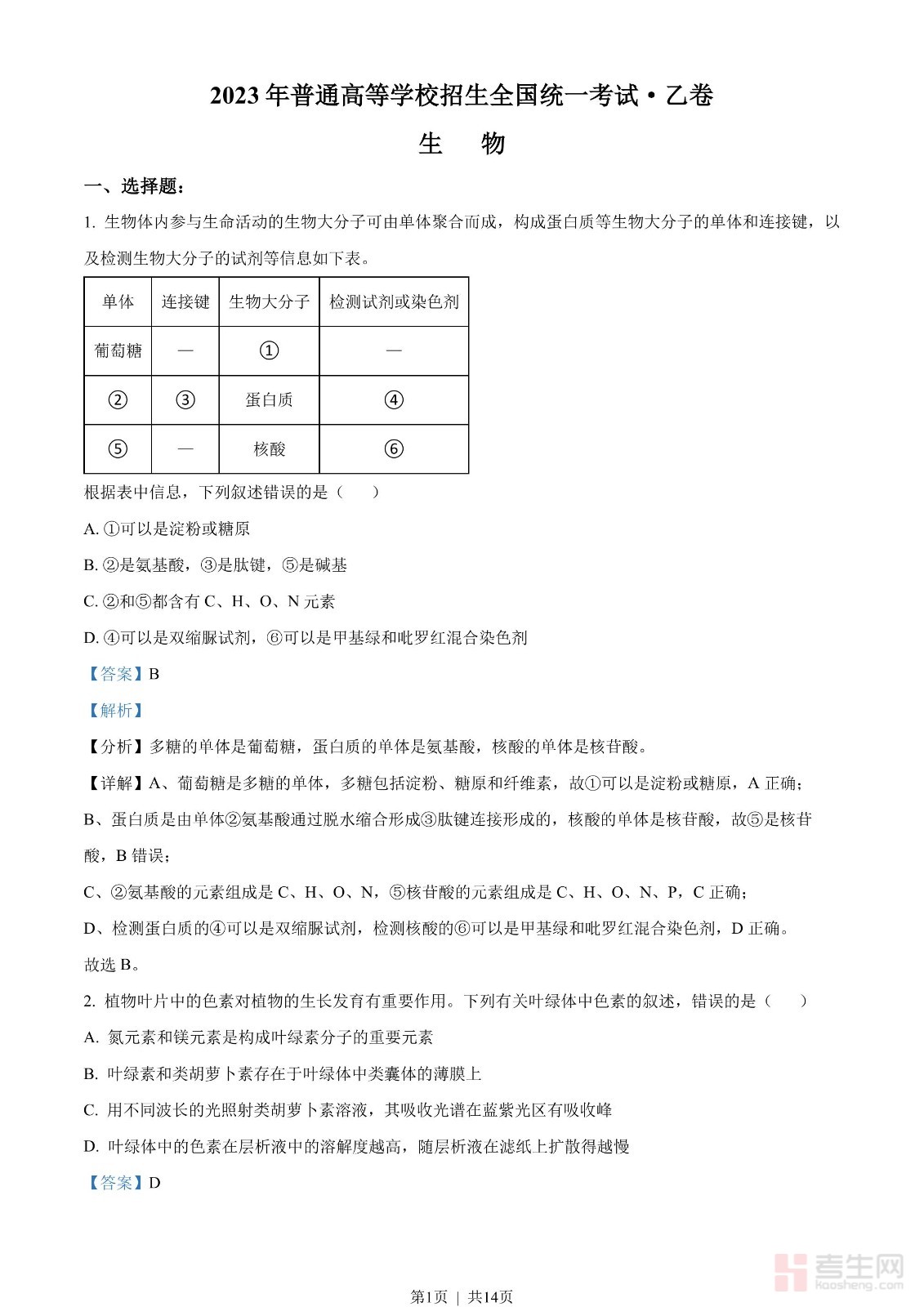 2023年高考生物试卷(全国乙卷)(解析卷)