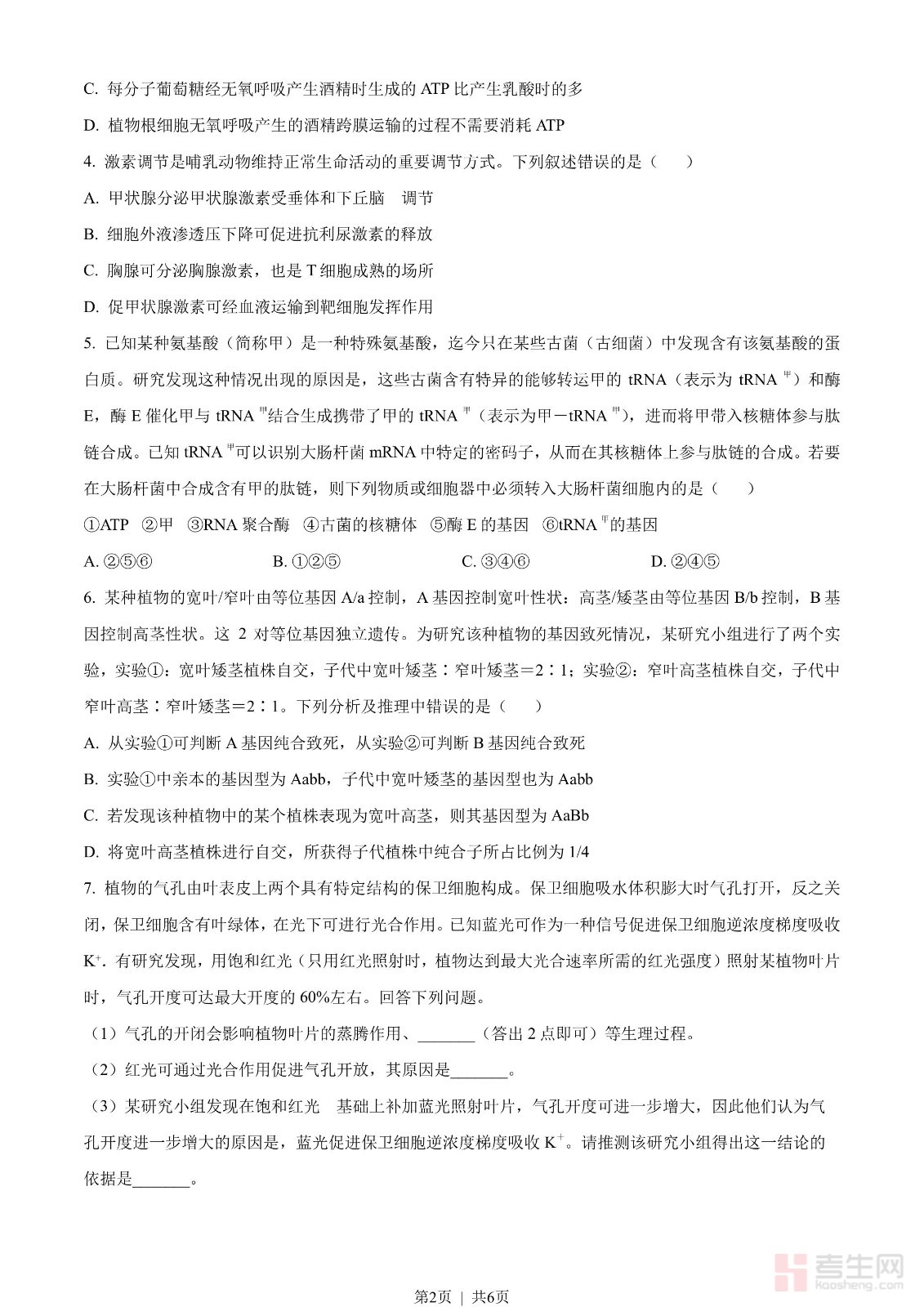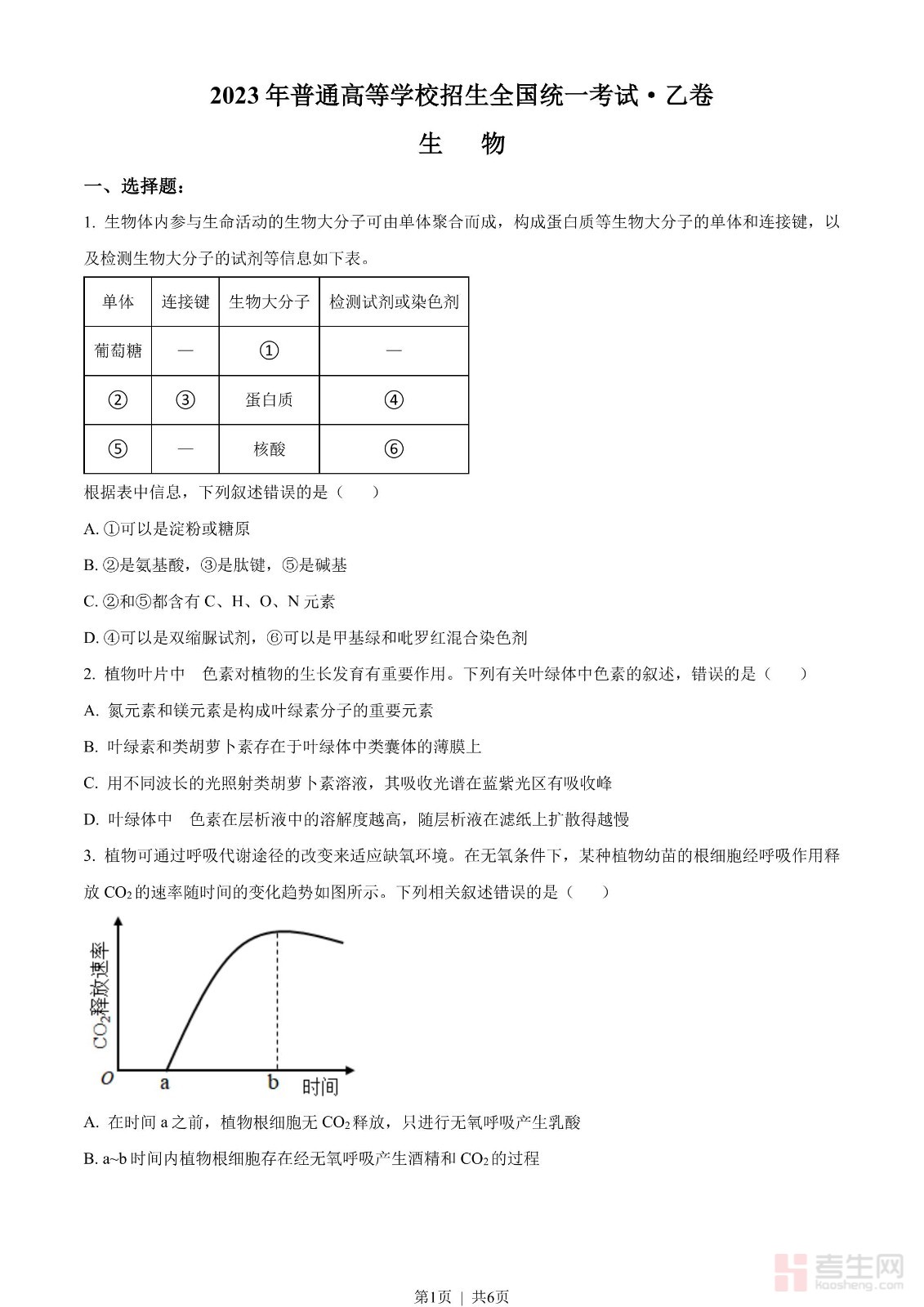 2023年高考生物试卷(全国乙卷)(空白卷)