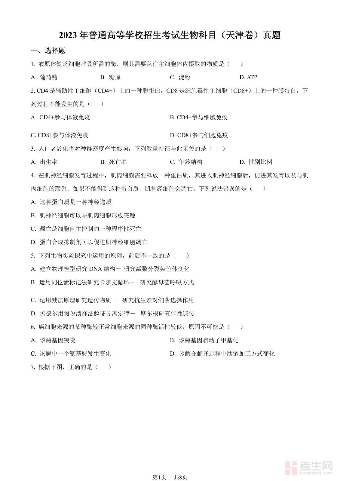 2023年高考生物试卷(天津)(空白卷)