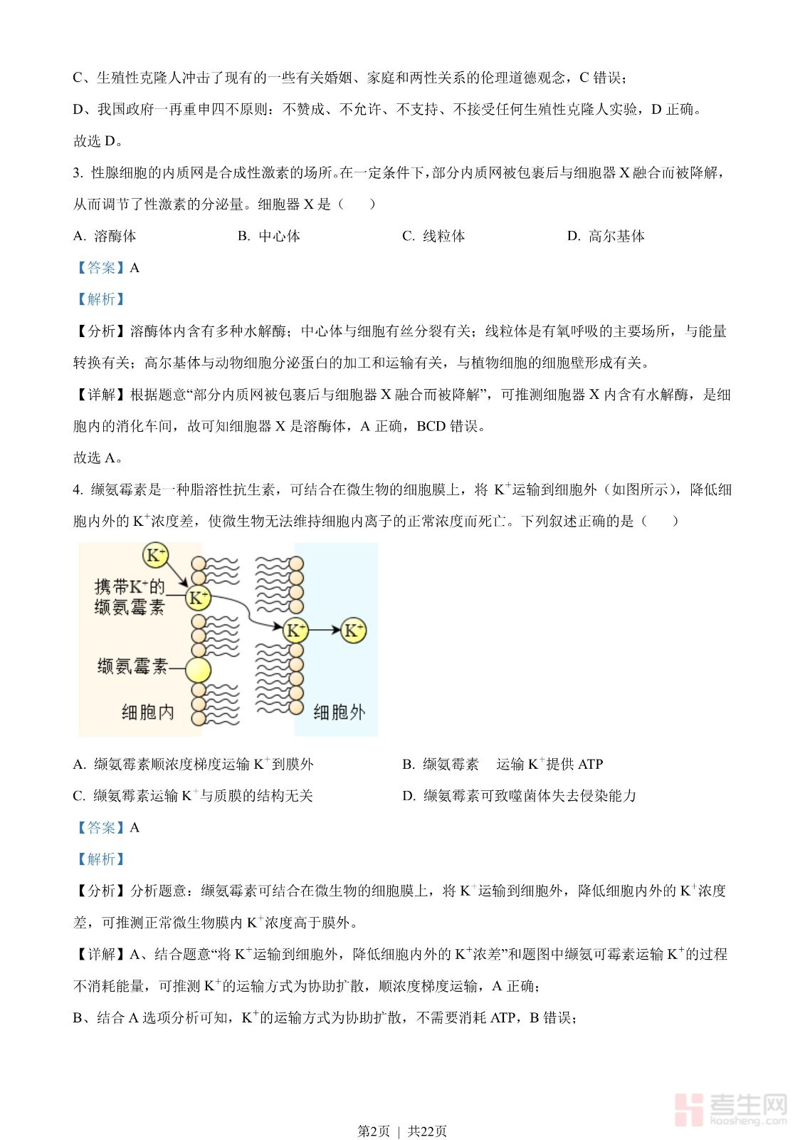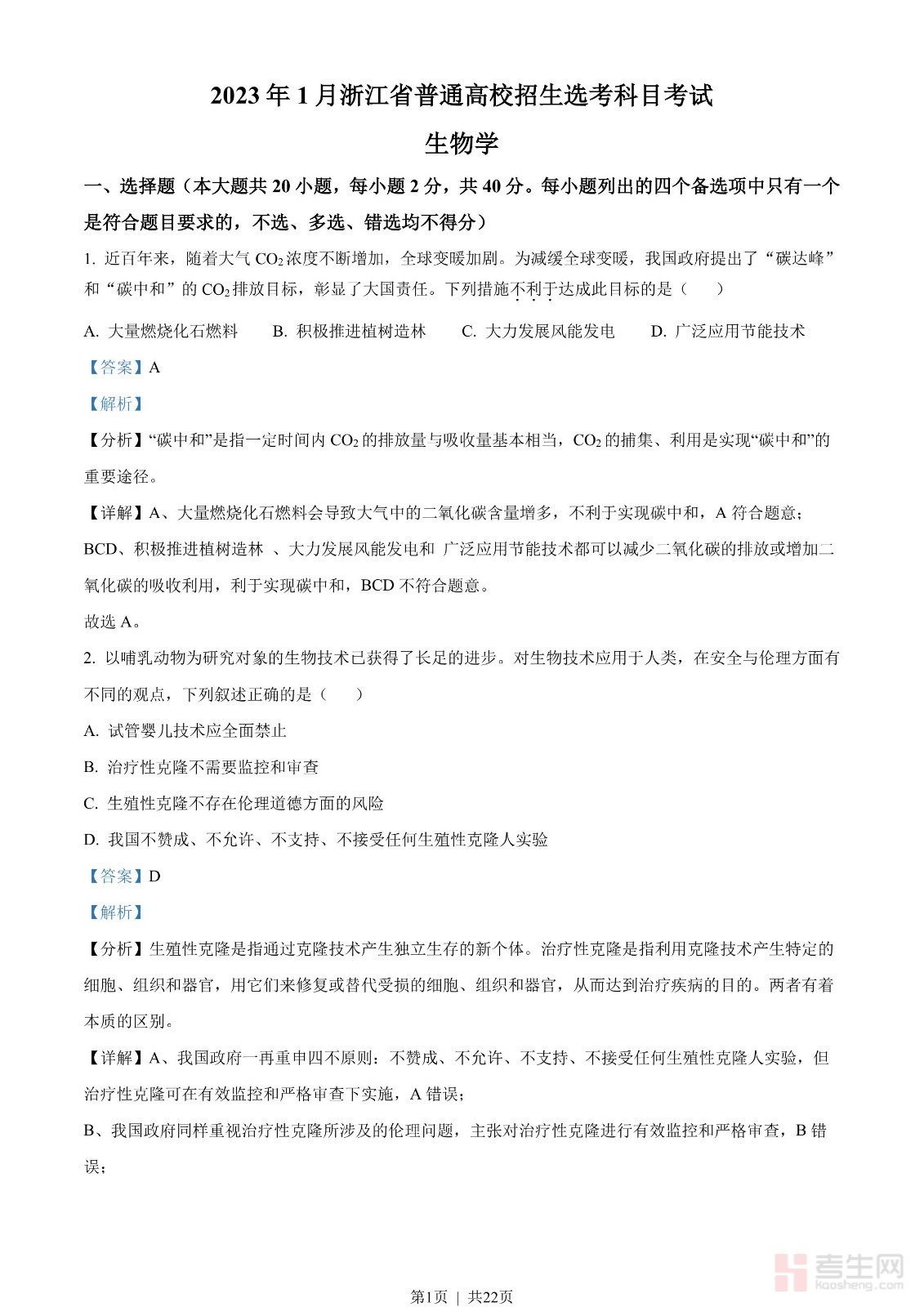 2023年高考生物试卷(浙江)【1月】(解析卷)