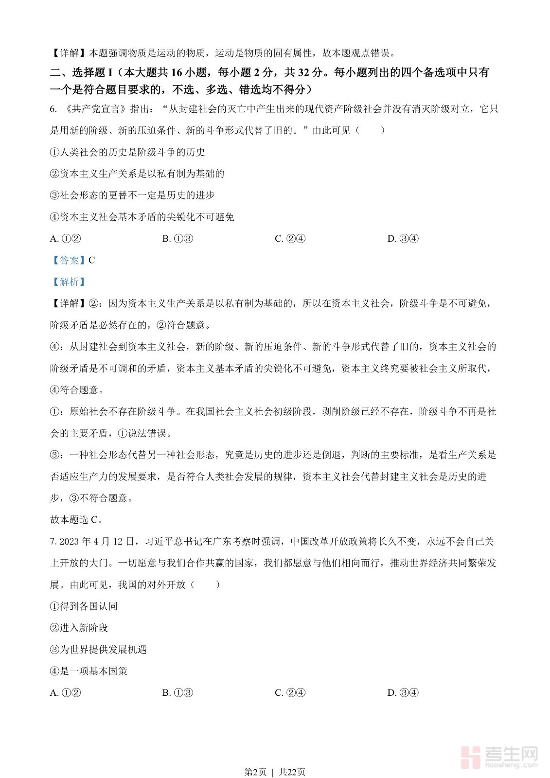 2023年高考政治试卷(浙江)(6月)(解析卷)