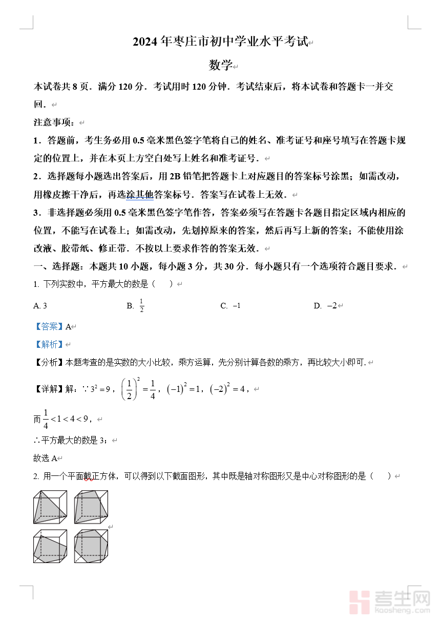 2024年山东省枣庄市中考 数学试题(枣庄聊城临沂菏泽)(解析版)