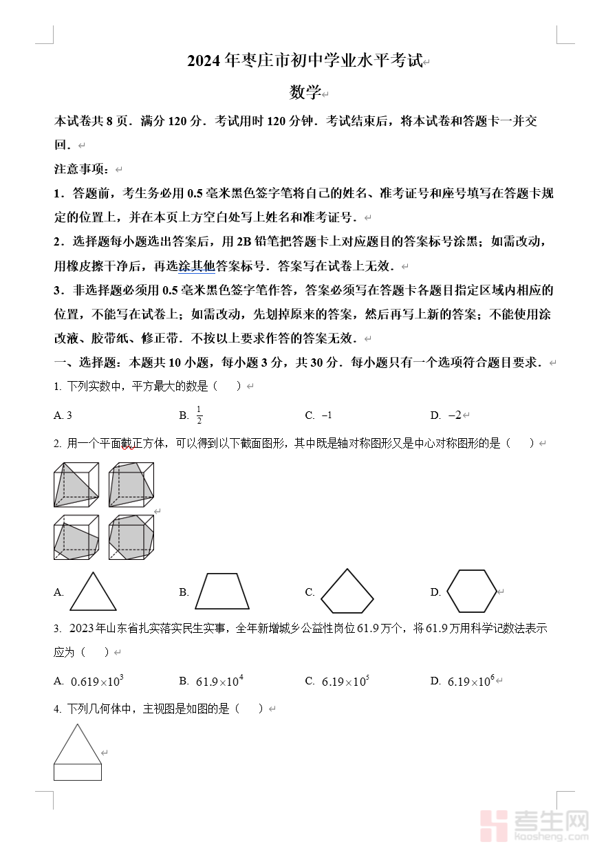 2024年山东省枣庄市中考 数学试题(枣庄聊城临沂菏泽)(原卷版)