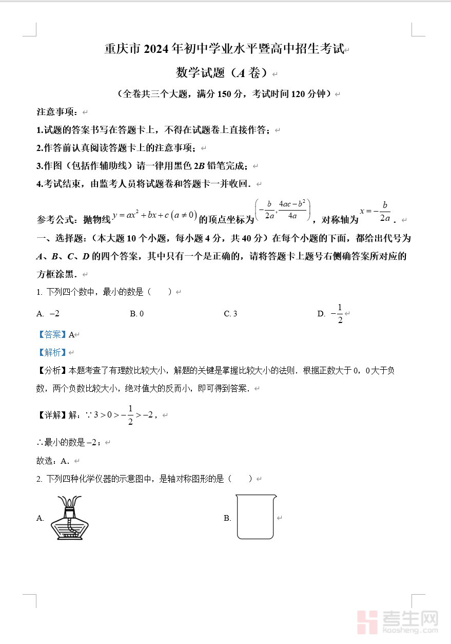2024年重庆市中考真题(A卷)数学试题(解析版)