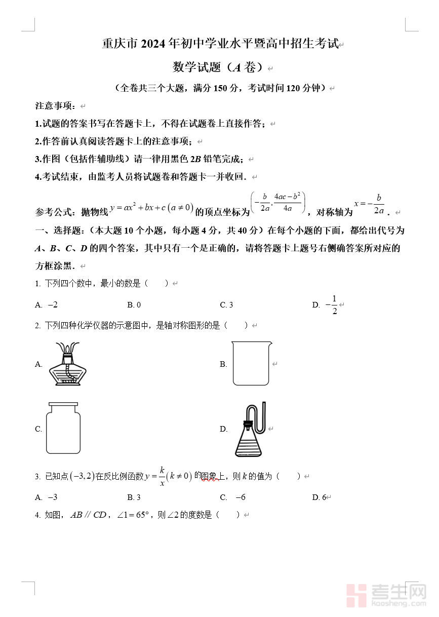 2024年重庆市中考真题(A卷)数学试题(原卷版)