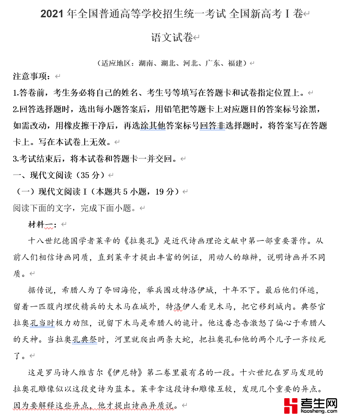2021年全国新高考Ⅰ卷语文真题试卷(Word版,含解析)