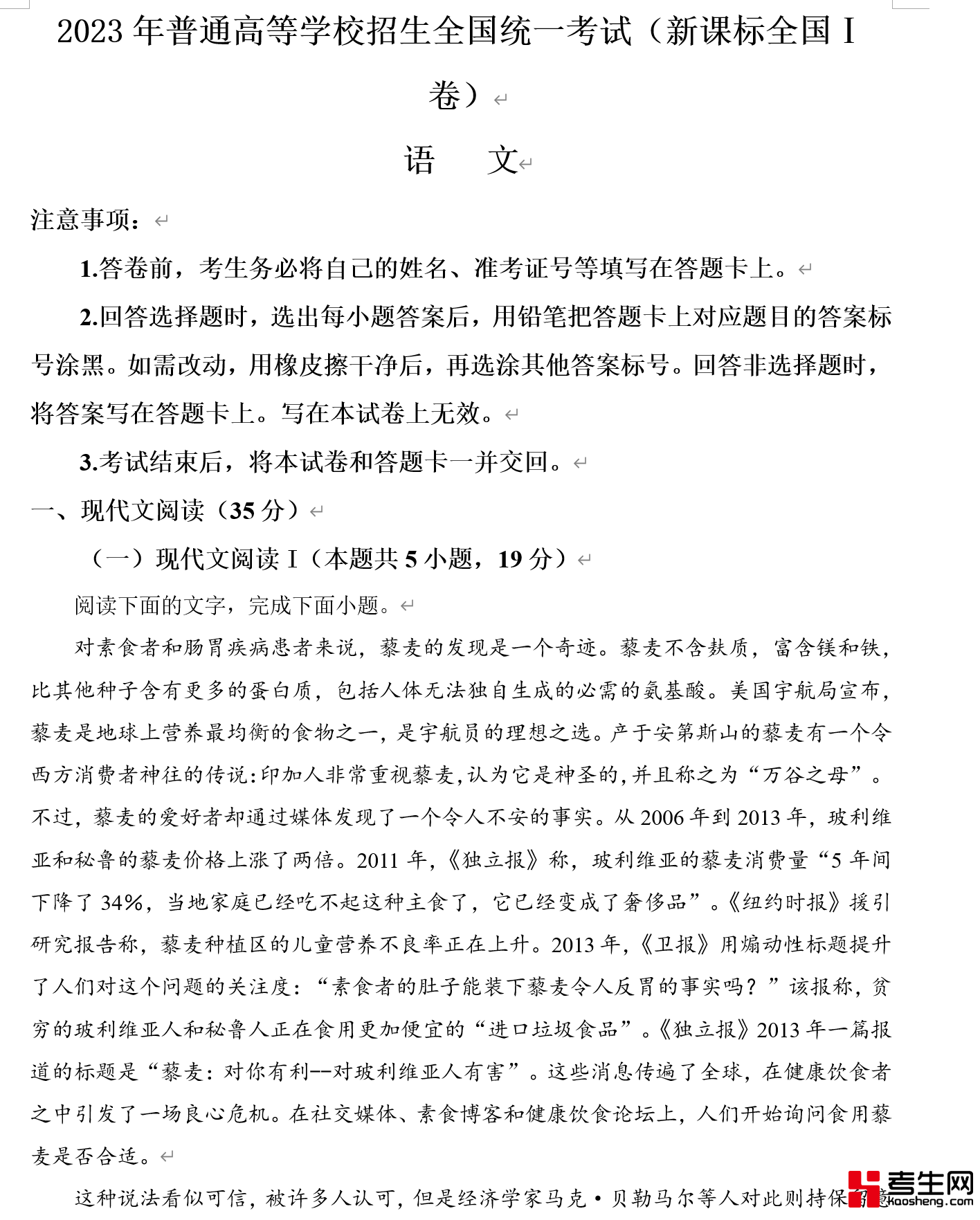 2023年普通高等学校招生全国统一考试(新课标全国Ⅰ卷) 语 文