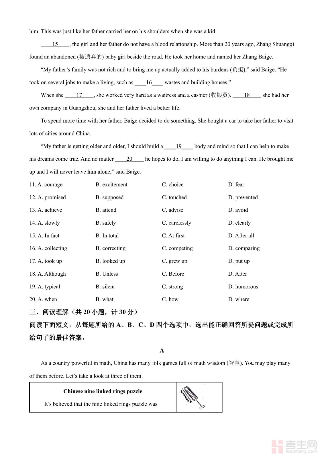2024年河南省中考英语真题(原卷版)