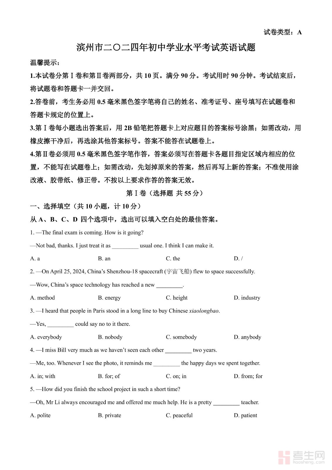 2024年山东省滨州市中考英语真题(原卷版)