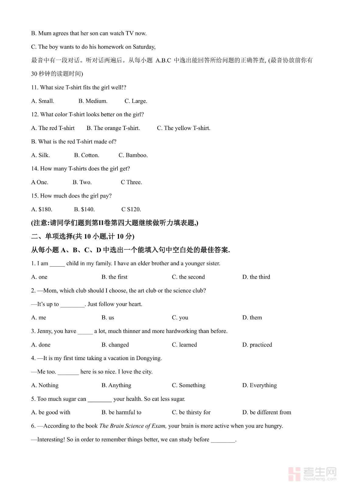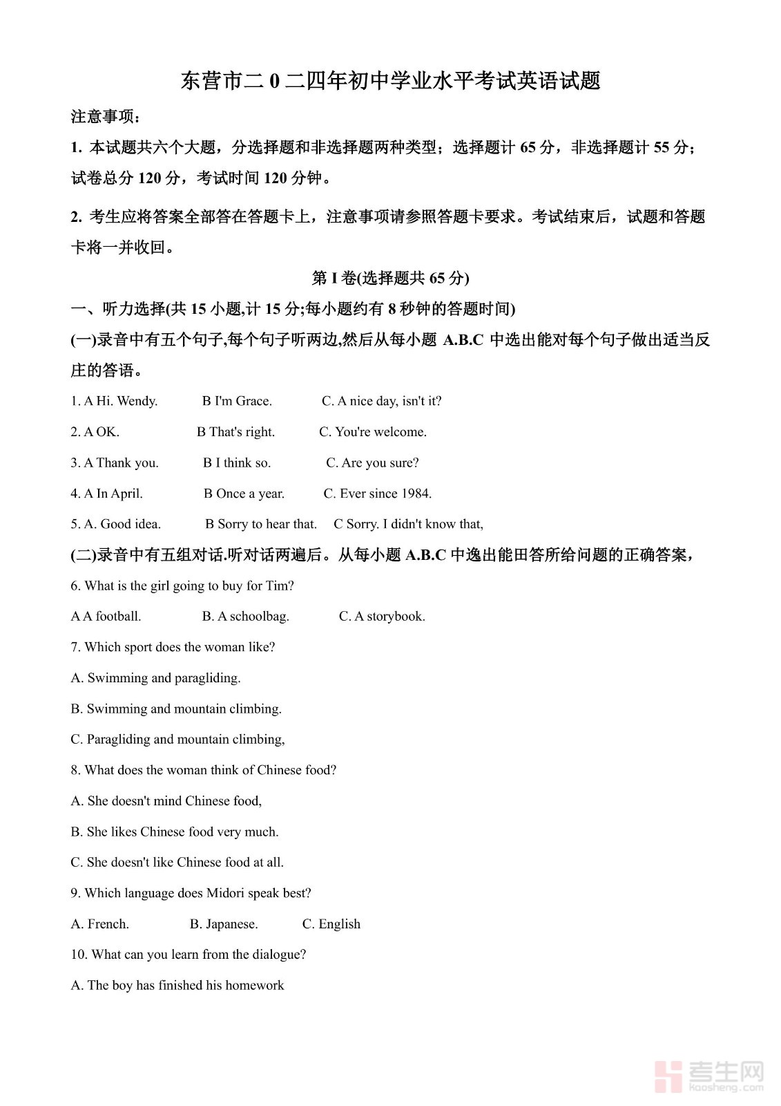 2024年山东省东营市中考英语真题(原卷版)