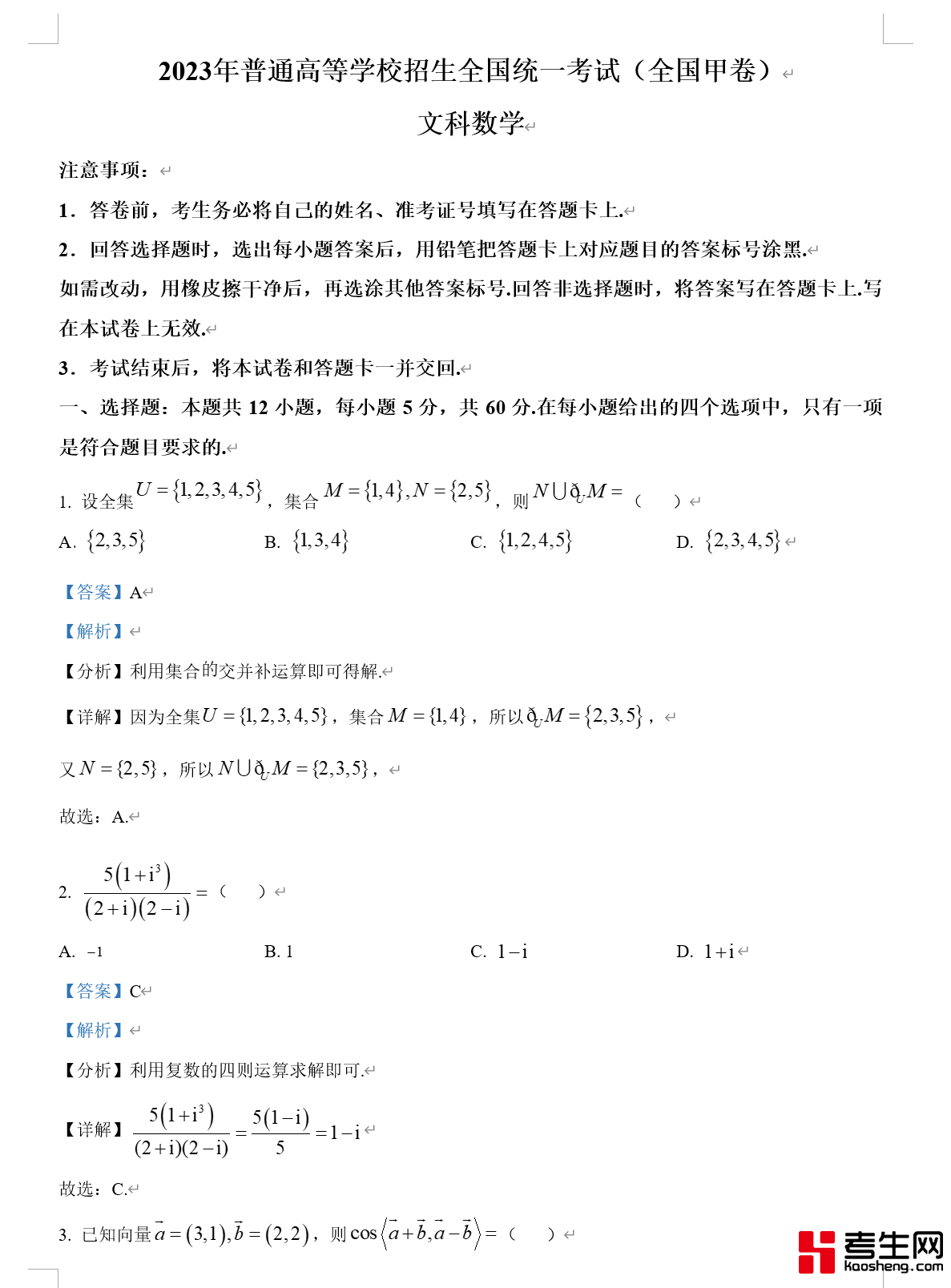 2023年高考全国甲卷数学(文)真题(解析版)