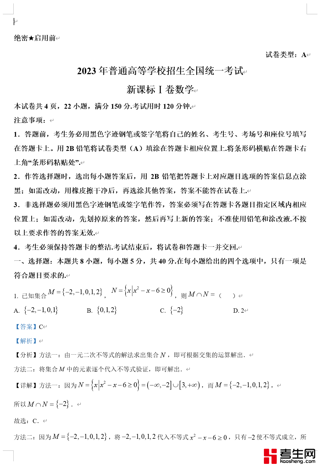 2023年新课标全国Ⅰ卷数学真题(解析版)