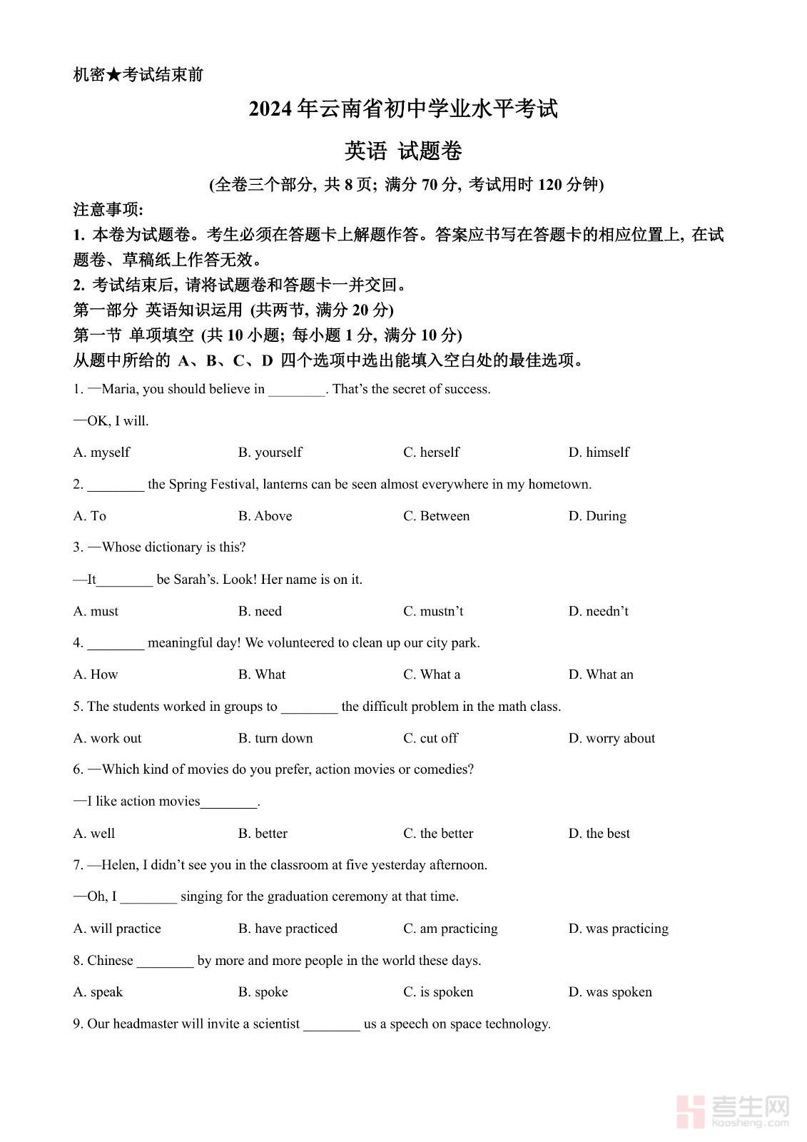 2024年云南省中考英语真题(原卷版)