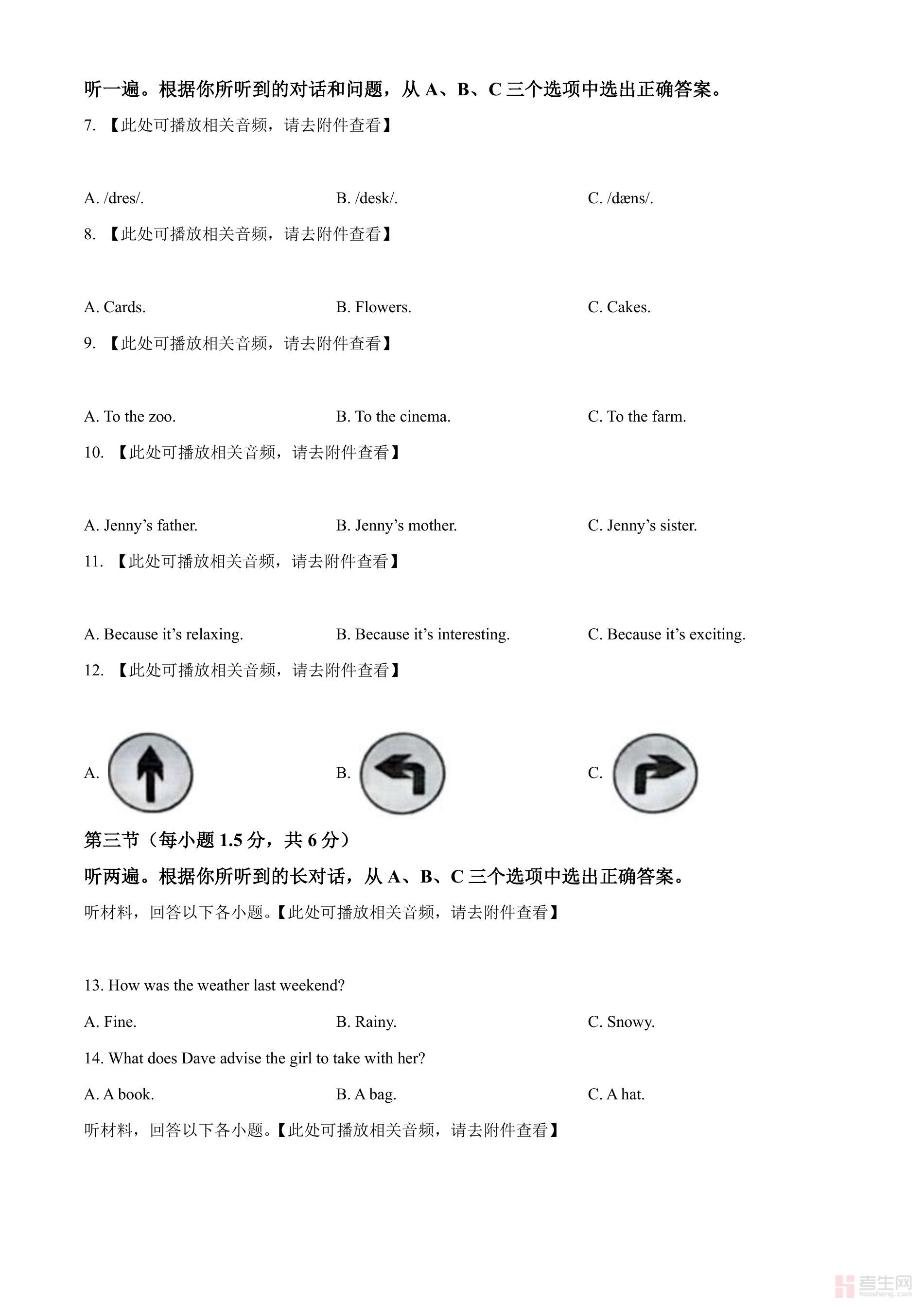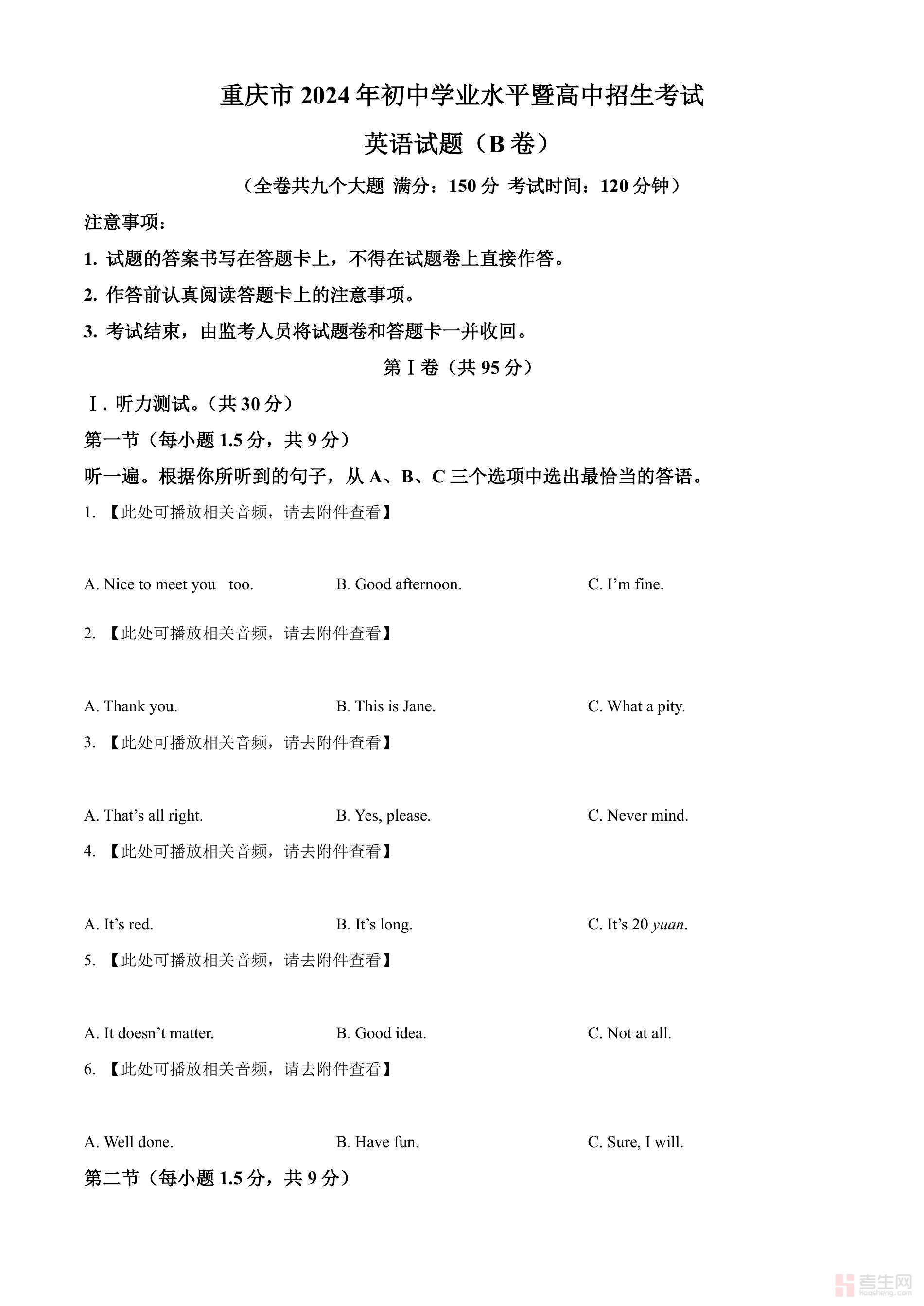 2024年重庆市中考英语真题(B卷)原卷含听力音频