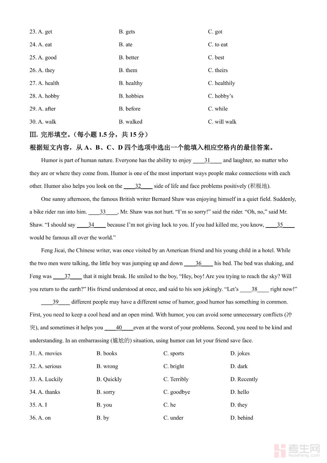 2024年河南省中考英语真题(原卷版)