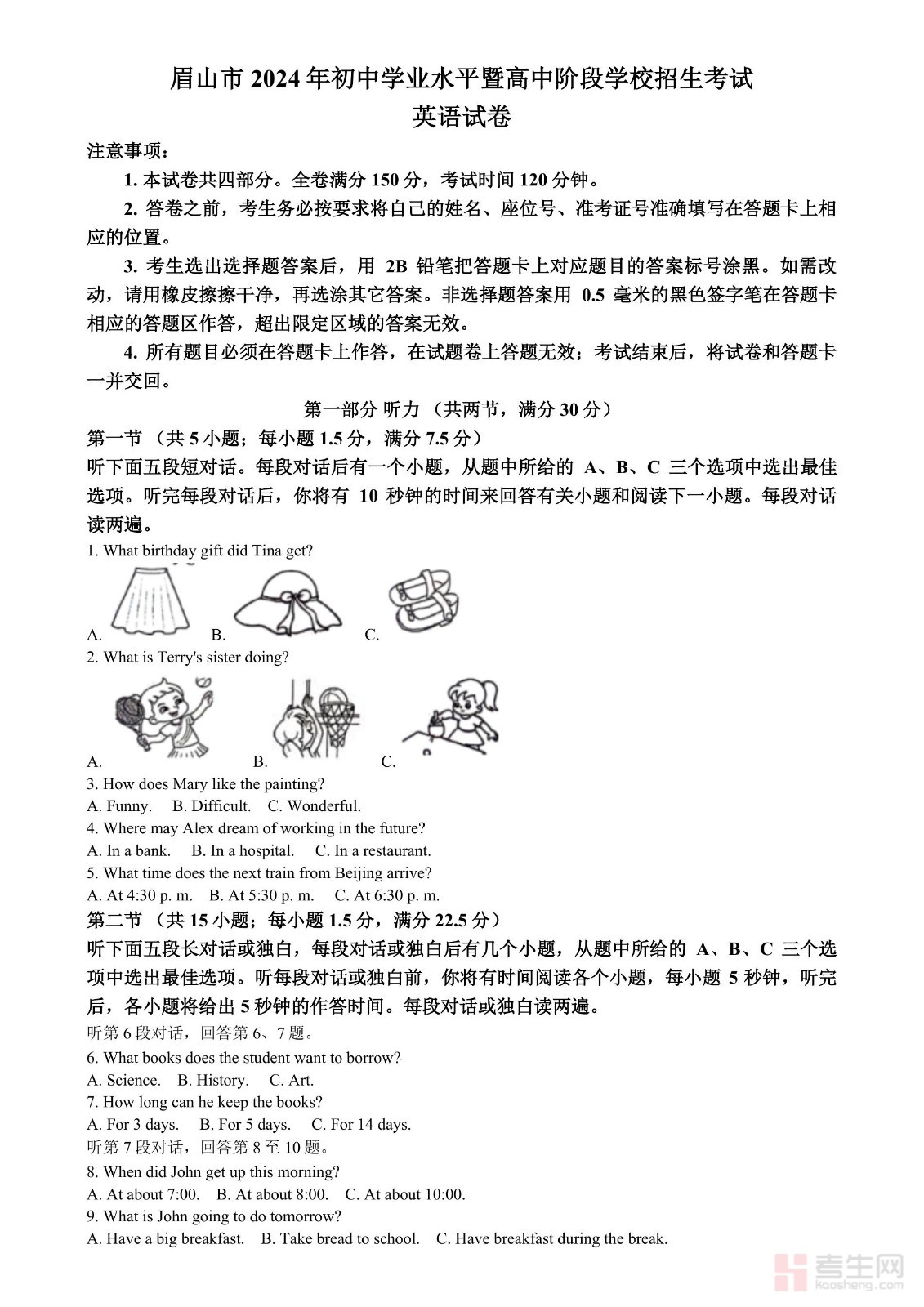 2024年四川省眉山中考英语真题(原卷版)