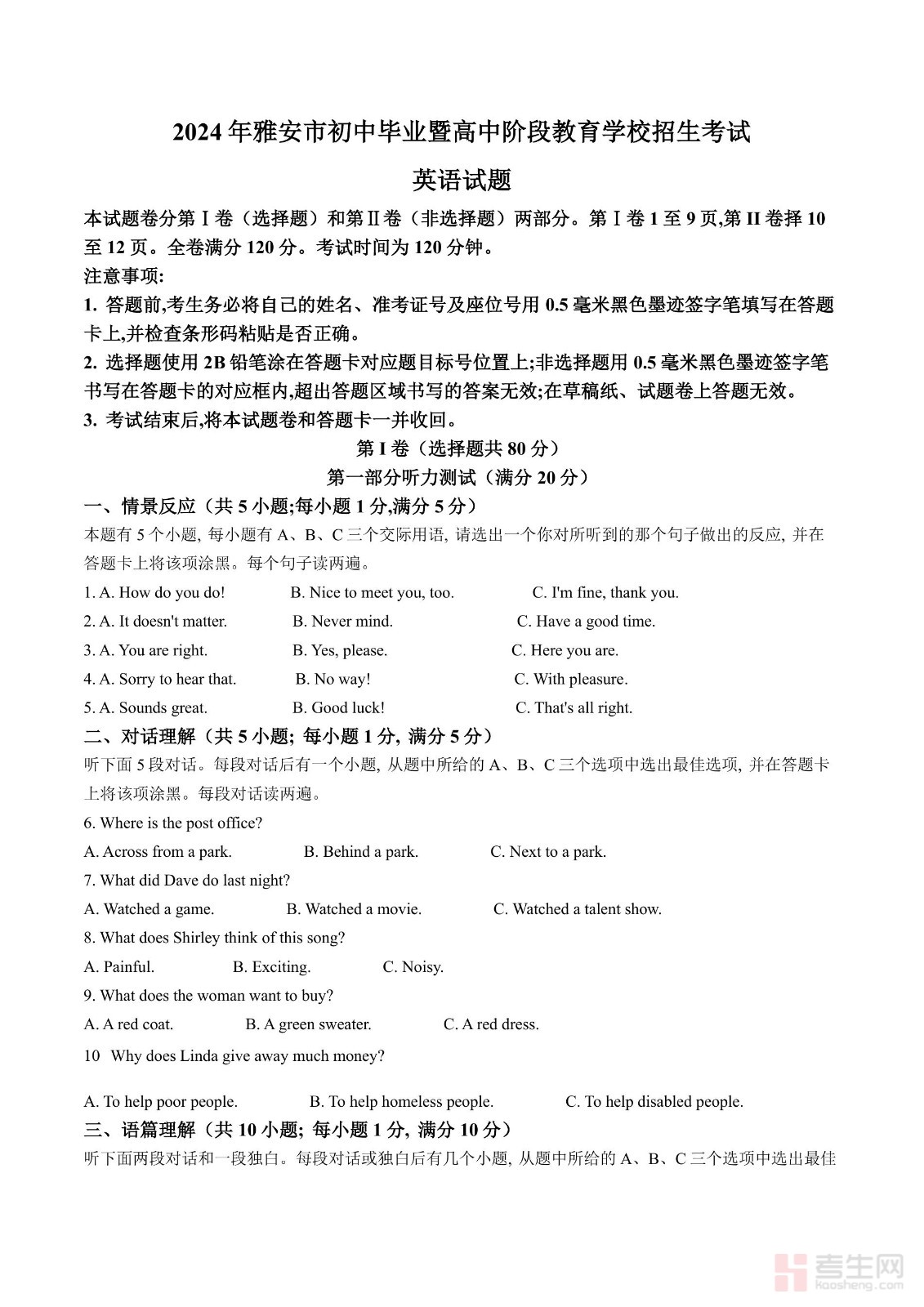 年雅安市初中毕业暨高中阶段教育学校招生考试