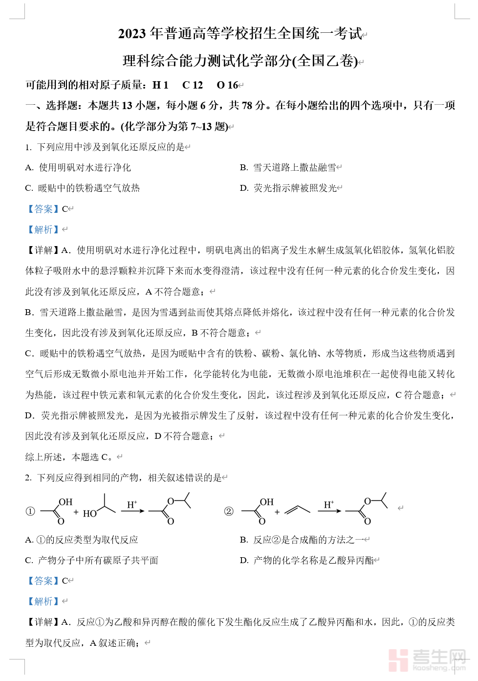 2023年高考全国乙卷化学真题(解析版)