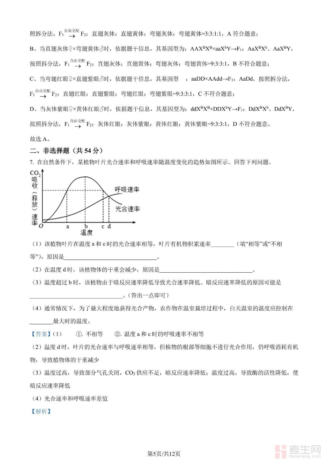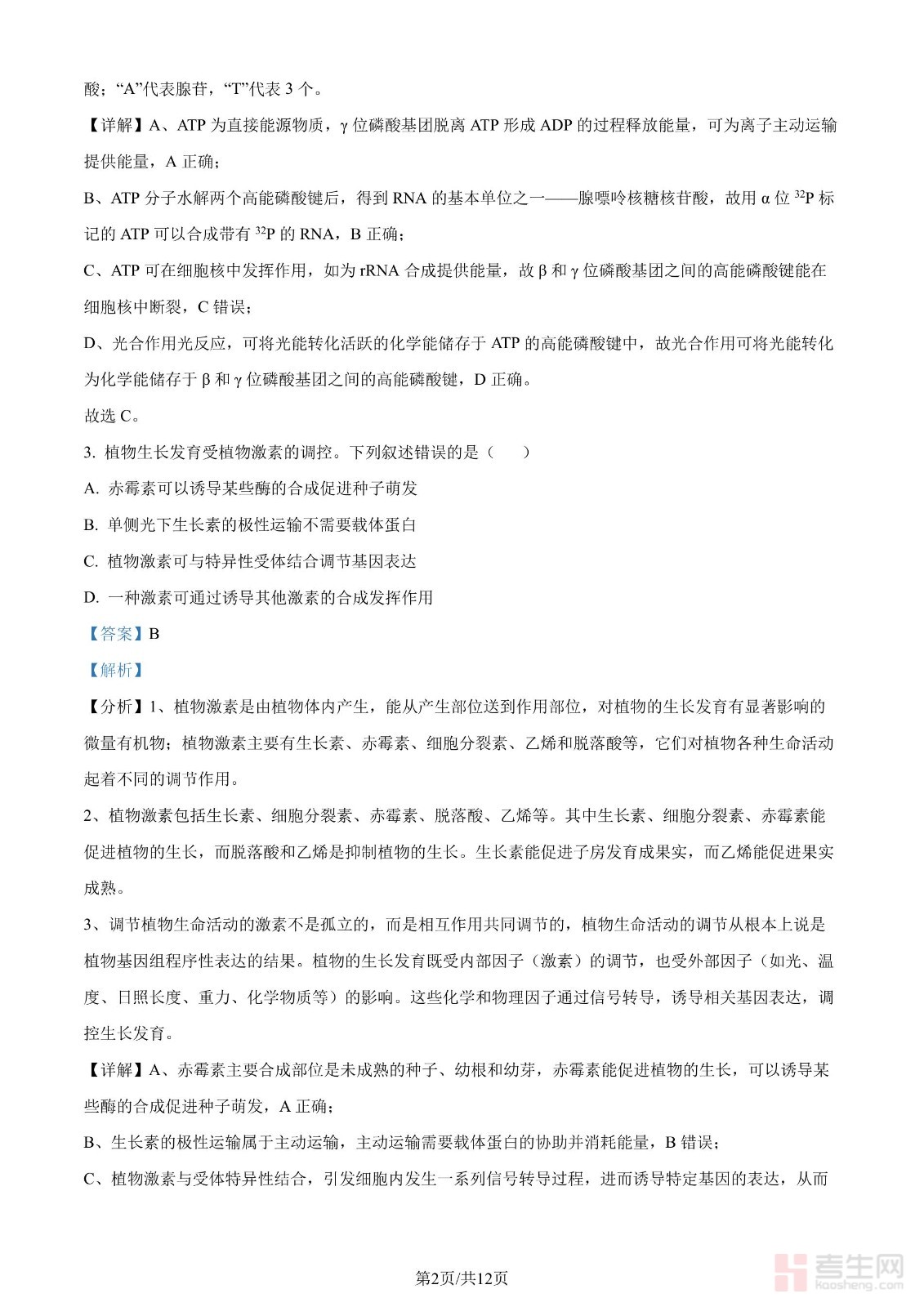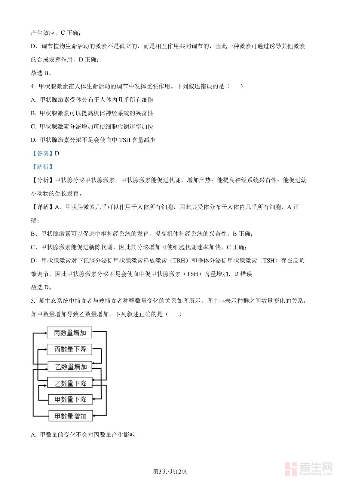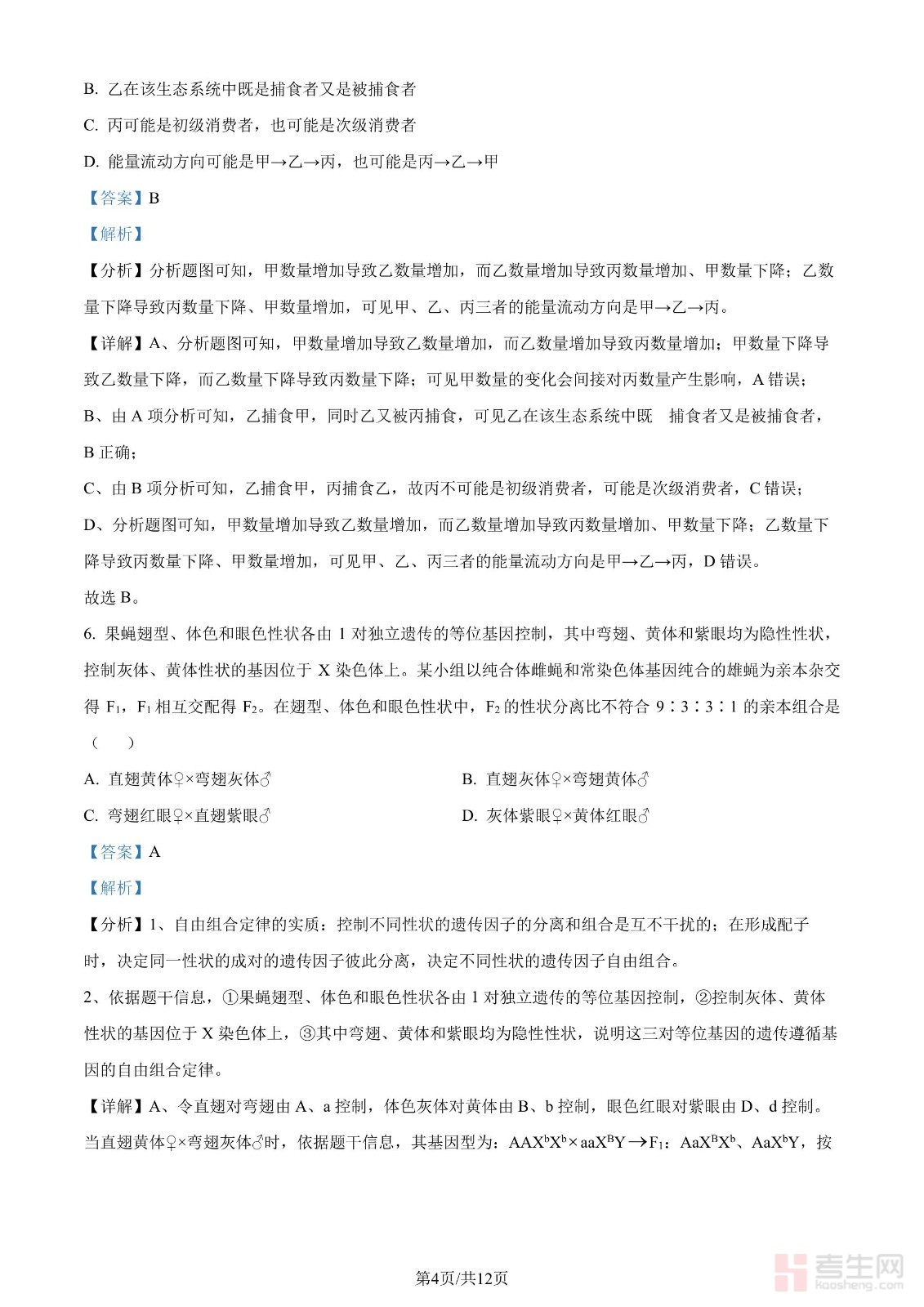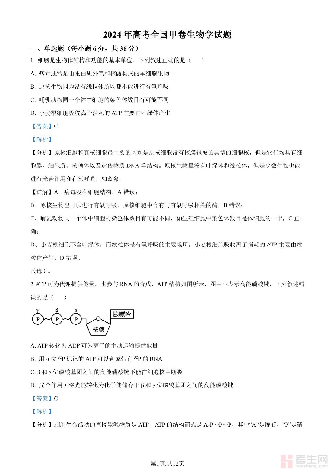 年高考全国甲卷生物学试题