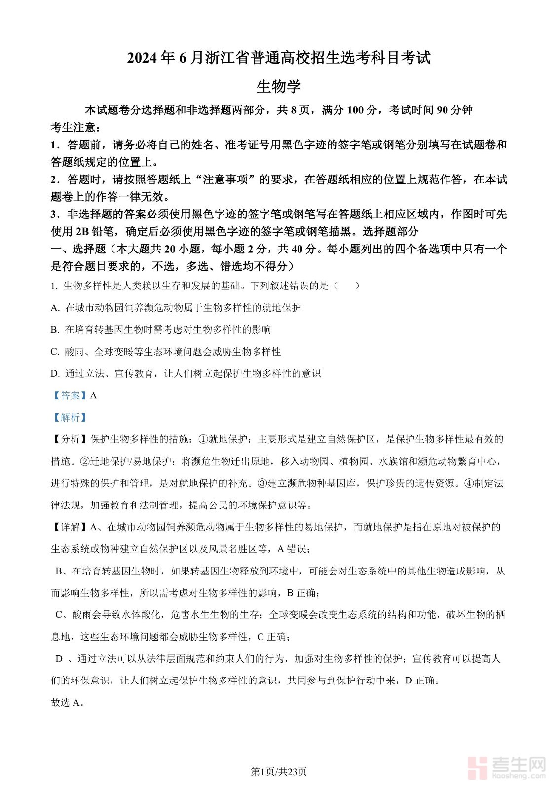 2024年高考生物试卷(浙江)(6月)(解析卷)