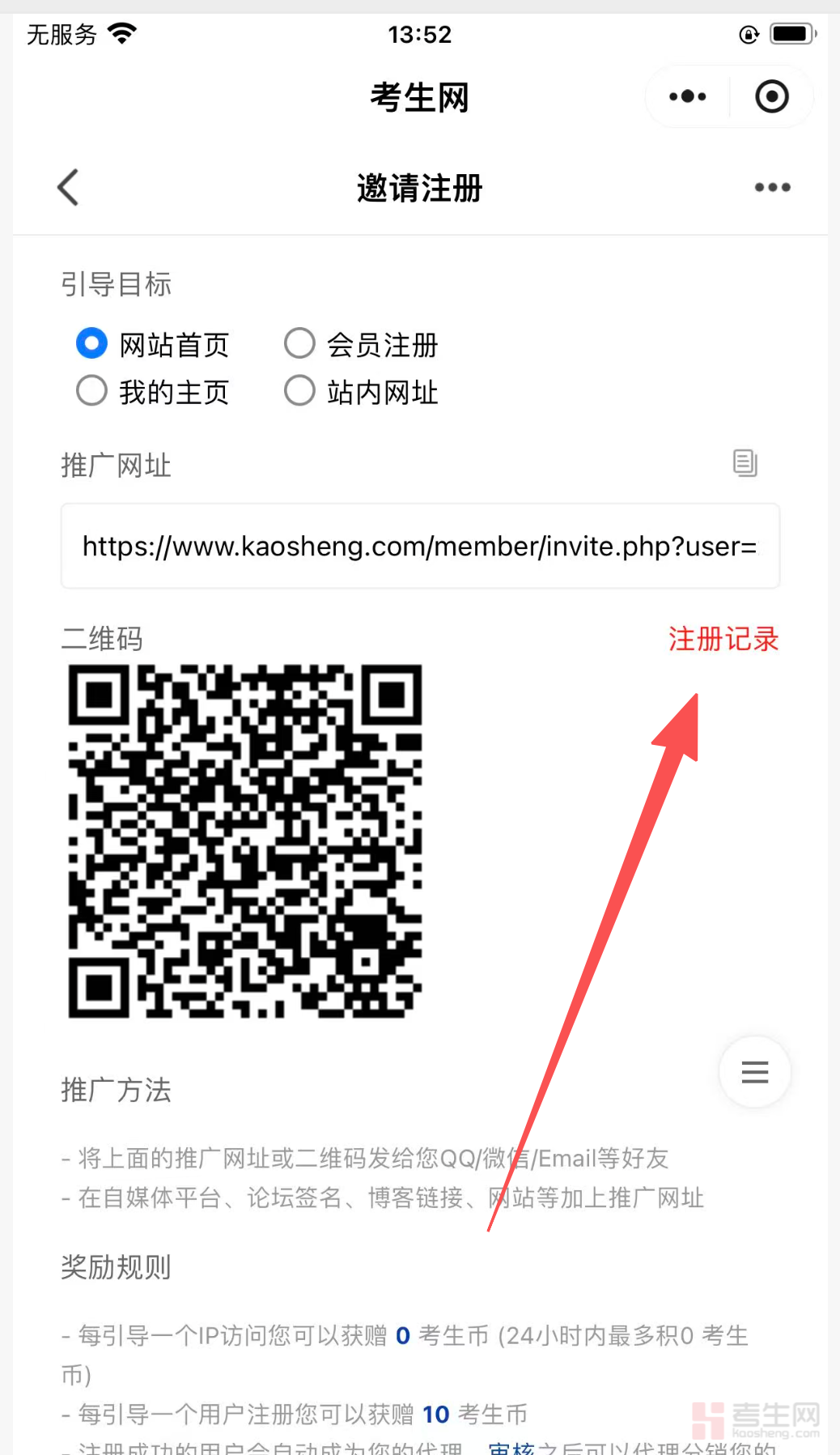 您可以看到“邀请注册”的页面,这里有您用来推广的专属二维码,在专属二维码右上角有红色的“注册记录”,点这个红色的字
