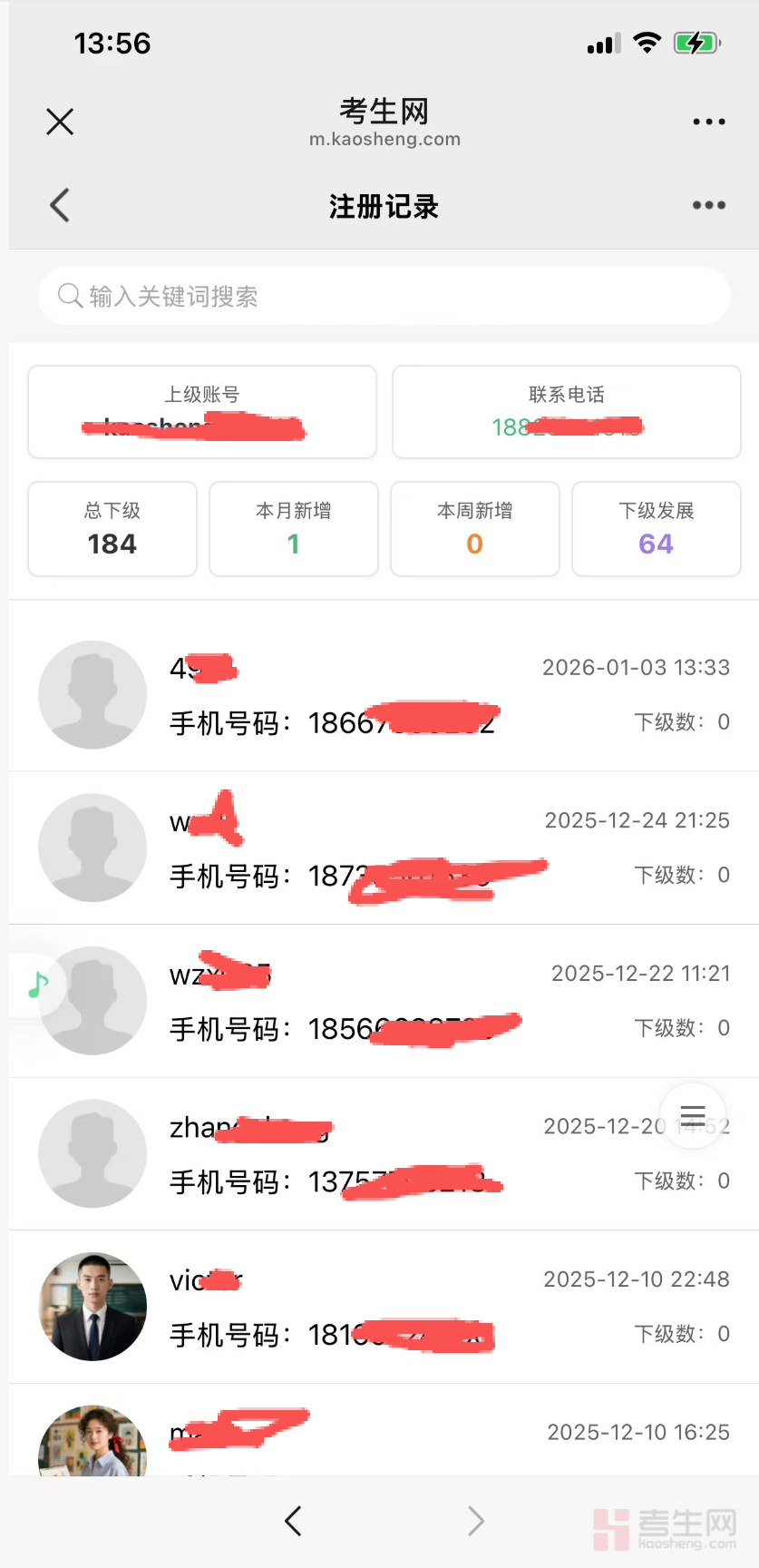 如果您已经成为考生网的会员,您可以随时随地看到自己的业绩,通过邀请记录,可以看到自己团队的上级联系方式,也可以看到自己下级用户的联系方式,并可以清晰的看到直接下级用户推广业绩的情况。
