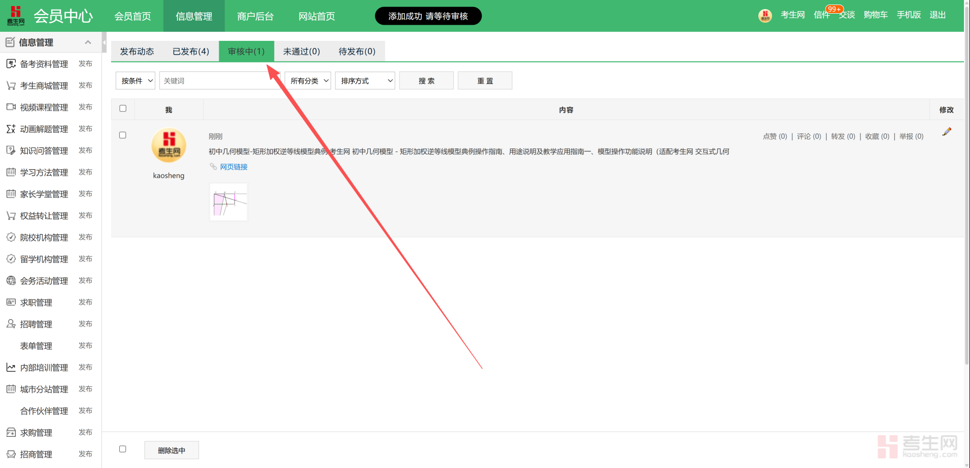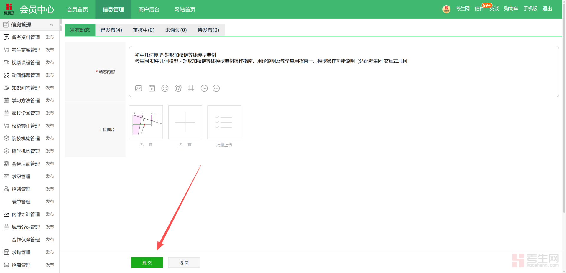 现在,您完善信息后,点击提交就可以发布了,如果发布成功,根据不同权限,可能需要审核,审核后,您就可以在个人空间里,看到自己空间里面也有这个信息了