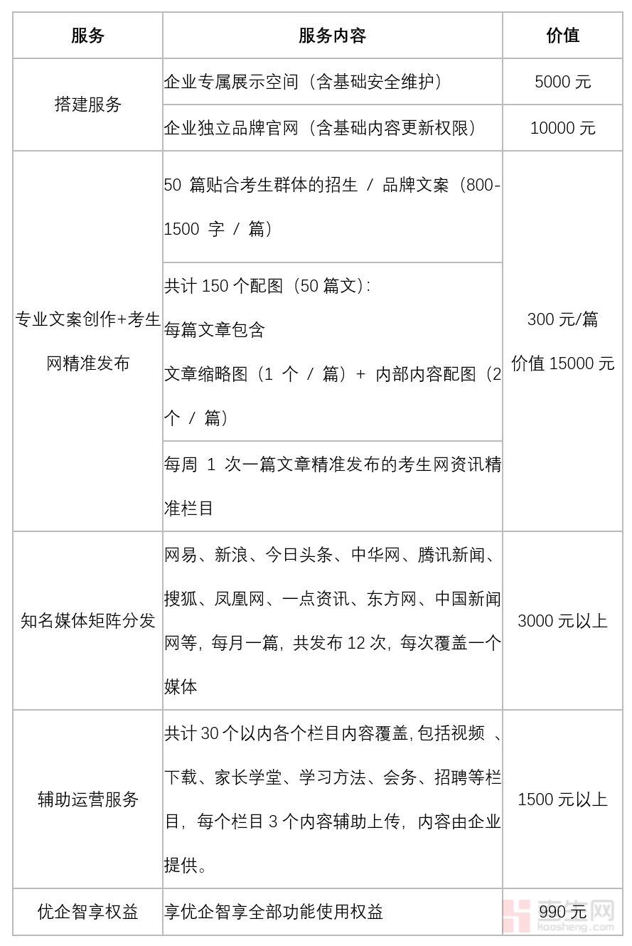 算笔 “实在账”:单独买这些服务至少花 37500+,现在企业 VIP这些服务全打包仅仅只需要5990元全包!花一份钱就把 “品牌阵地 + 内容弹药 + 权威曝光 + 运营辅助” 全搞定,做招生 / 品牌推广直接 “拎包入住”。